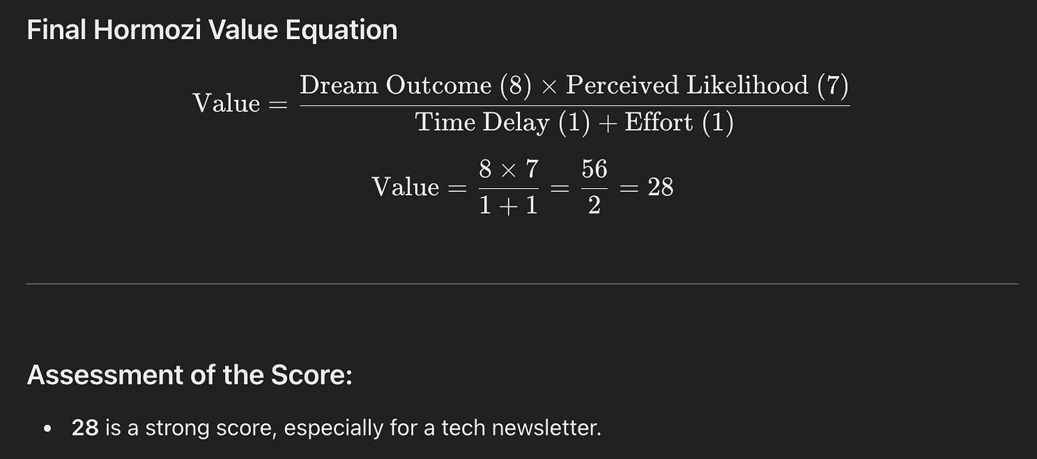 This week I was quite blown away learning about Hormozi’s value equation for assessing value of products. I even used it to have ChatGPT calculate the value of this newsletter 😆.
